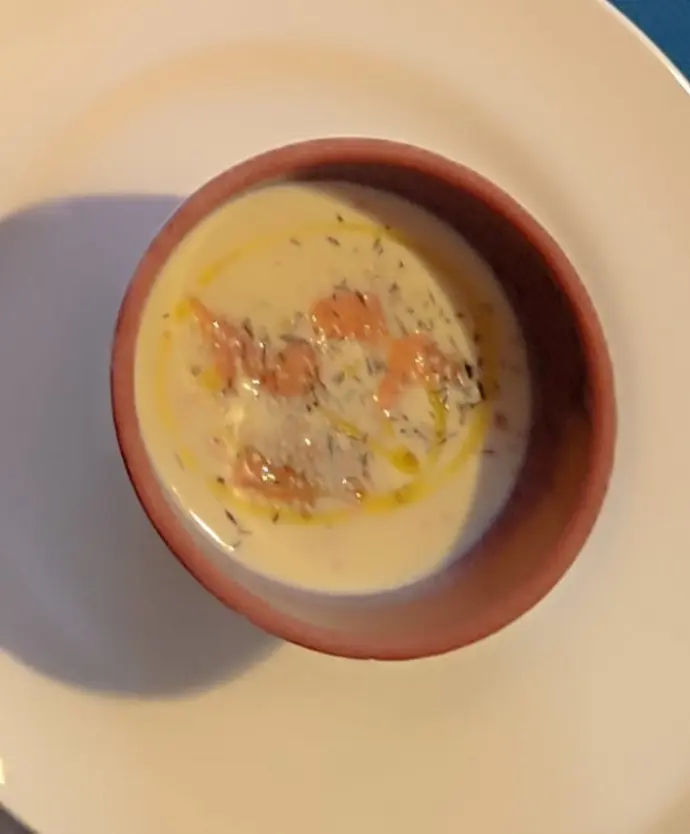 Sirve con tacos de salmón ahumado, ralladura de limón, tomillo y un chorrito de aceite de oliva virgen extra.