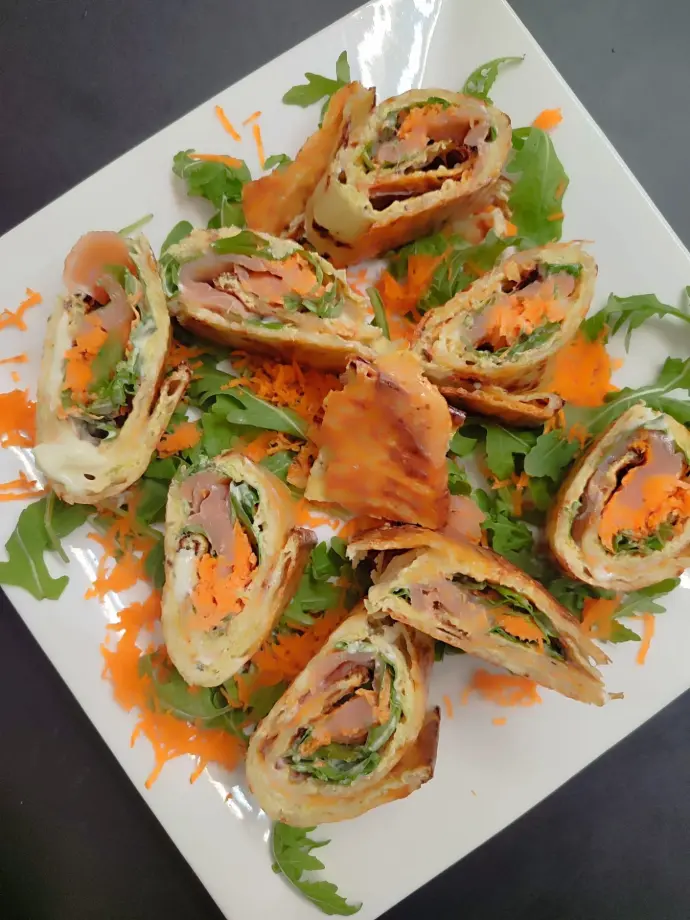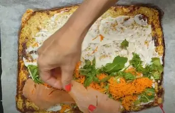 Una vez frío, ponemos, mayonesa casera, zanahoria rallada, salmón ahumado y rúcula.