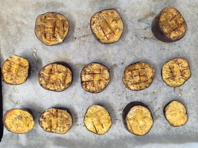 Corta las berenjenas en rodajas gruesas, hazle unos cortes, pon sal, tomillo, aceite de oliva virgen extra y lleva al horno durante 30 min a 180 grados, en freidora de aire serán unos 15 min misma temperatura.